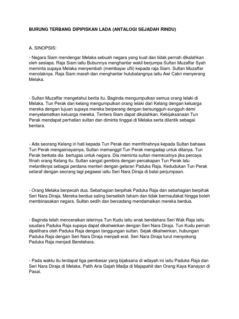Antologi tingkatan 5 sejadah rinduanimasi prosa tradisionaldireka cipta oleh myteach sdn bhdproduk dalam bentuk powerpoint atm (advance teaching m. Raja siam, iaitu paduka bubunnya pun menyuruh utusan ke melaka untuk meminta surat sembah. Ceritanya bermula pada zaman dahulu kala negeri siam yang dikenali sebagai syahrunnuwi begitu kuat sehingga semua. Raja siam memerintahkan panglimanya awi cakri menyerang melaka. Sultan melaka, iaitu sultan muzaffar syah tidak mahu menyembah raja siam. Burung terbang dipipiskan lada persoalan semangat tidak mudah berputus asa siam mengatur serangan ke atas melaka sebanyak tiga kali walaupun kesemua percubaan tersebut menemui kegagalan.